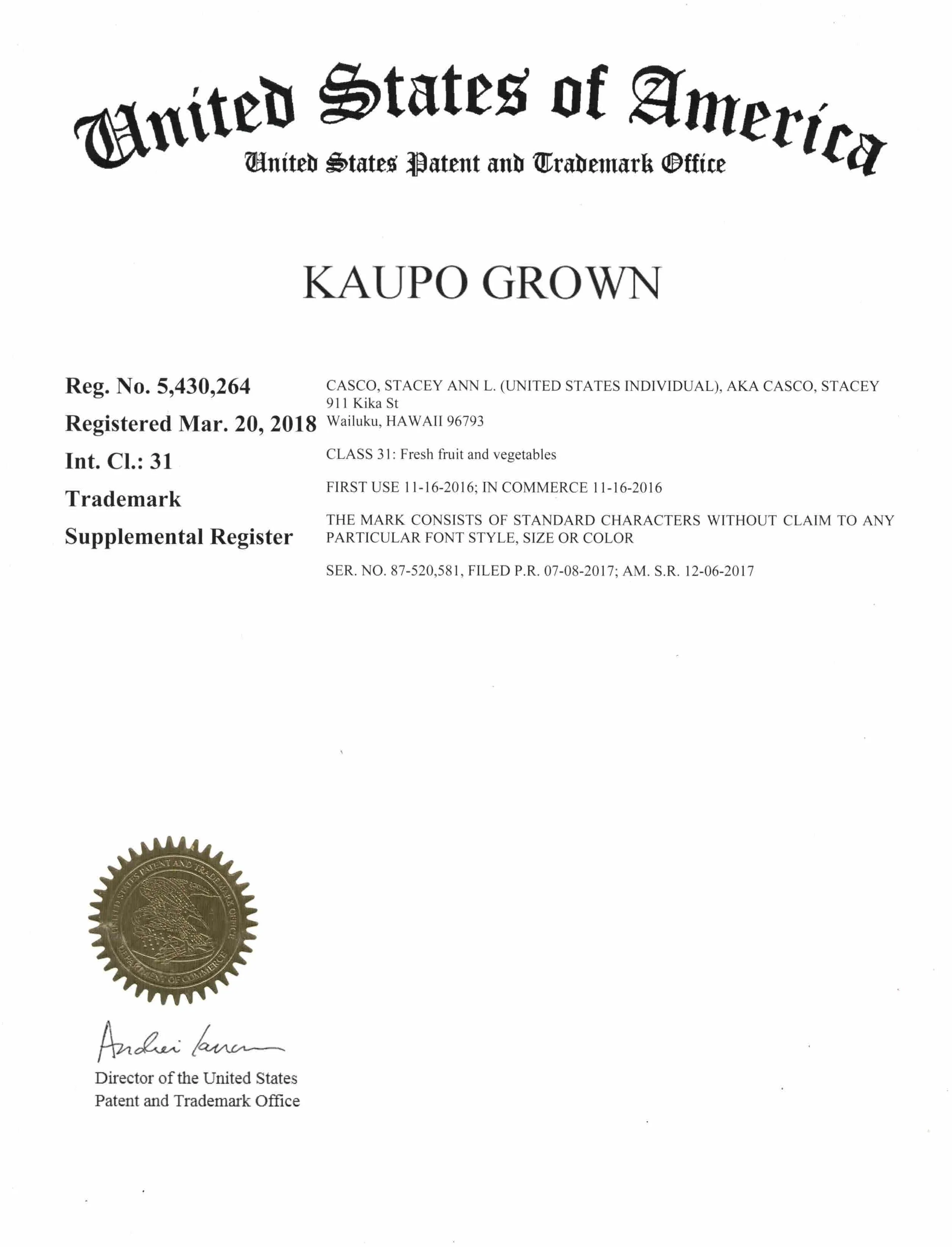 To protect the identity, integrity, and legacy of Kaupō’s people and place, our founder successfully registered Kaupō Grown™ as a trademark in 2016.